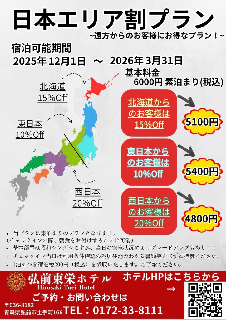 ☃冬季限定!!日本エリア割プラン販売中 2026年1月6日 お知らせ 遠方からお越しになるほど割引率の高いエリア割プランを販売しております。 お部屋は昭和シングルタイプですが、当日の空室状況によりお部屋の グレードUPもさせていただきます。 限定プランとなっておりますのでご利用はお早めにお願いいたします。