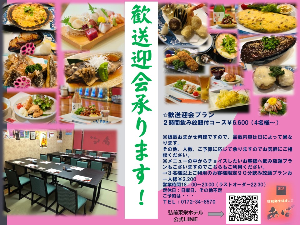 🐡津軽郷土料理の店あば 歓送迎会プラン受付中❣ 2026年1月27日 お知らせ 歓迎会・懇親会・慰労会など様々なシーンにご利用いただける大変お得なプランでございます。 新しい門出と新たな出会いを祝して、皆様で楽しんでいただける内容でお迎えいたします。 ご利用はお早めにどうぞ🌸